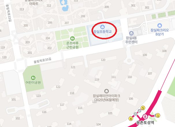 초등학교는 큰길 하나만 건너면 있는 잠실초등학교에 통학하게 된다.