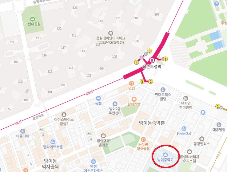 바로 인근에는 큰 학원가는 없지만, 라이딩하면 방이동과 삼전동 그리고 더 멀리 가면 대치동까지도 가능은 하다.