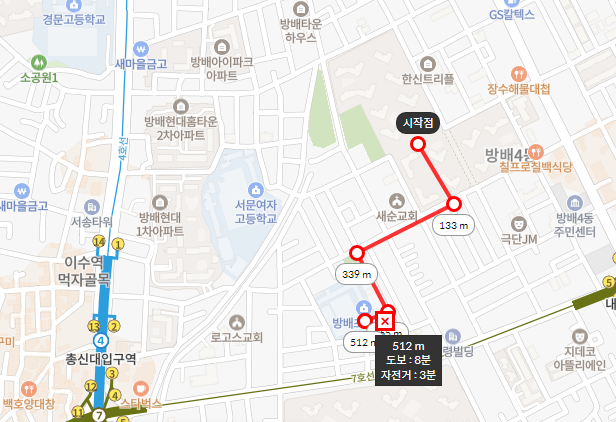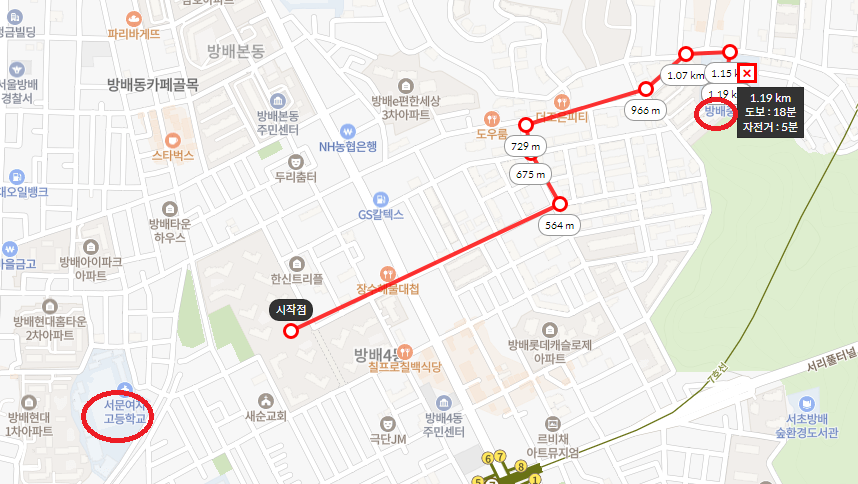 남자는 방배중학교로 배정을 받아야 하고 도보로 18분 가까이 걸려서 거리가 꽤나 먼 게 살짝 아쉽다.