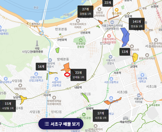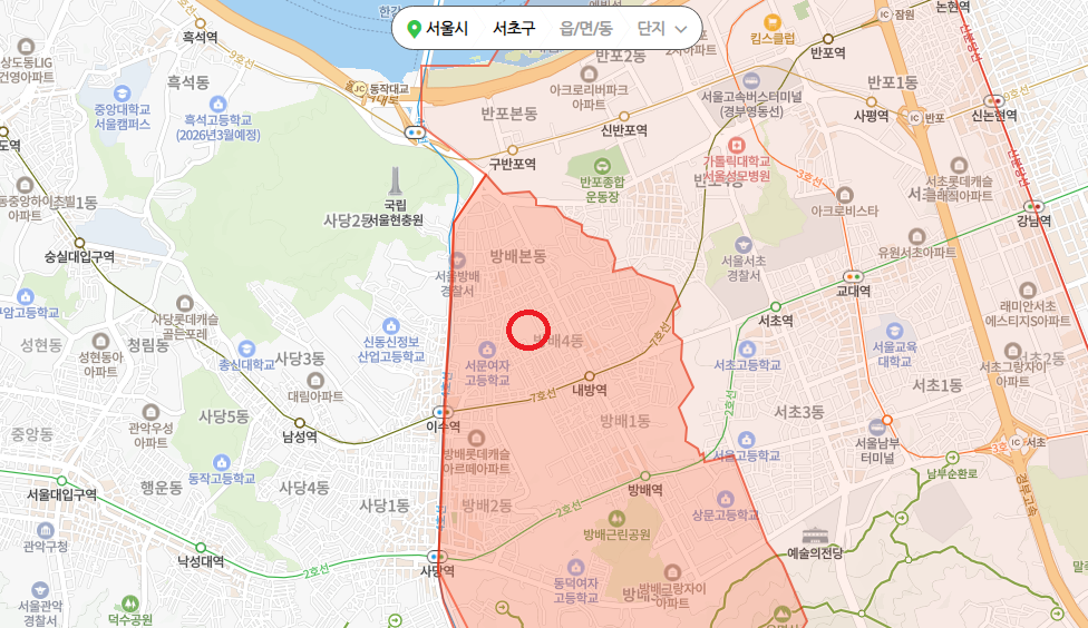 방배4동이고 지하철 4호선과 7호선 더블역세권인 이수역과 지하철 7호선 내방역 사이 정도에 위치해 있다.