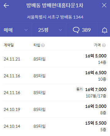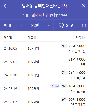 서문여중/서문여고 근처에 위치하고 4호선 이수역 (총신대입구역) 초 역세권인 644세대 27년 차 뱅배현대홈타운 1차 아파트 시세를 보자.