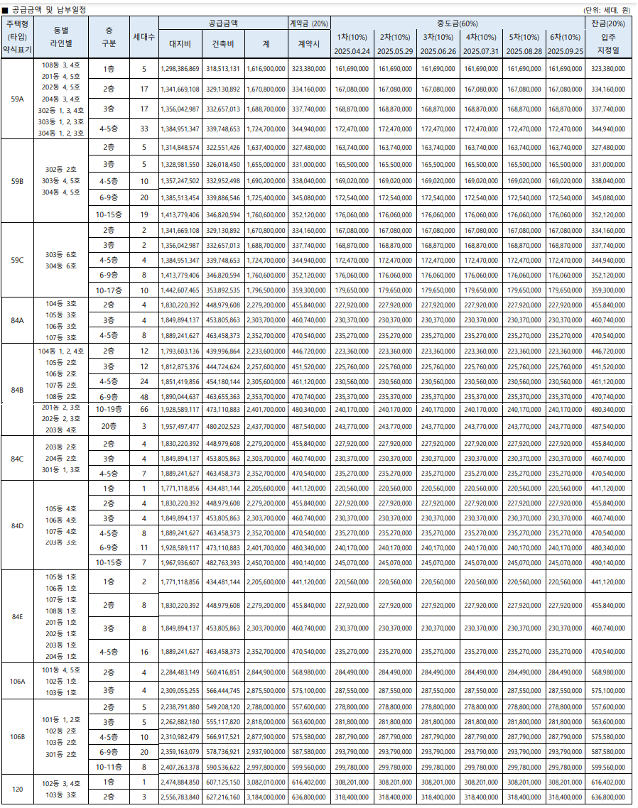 분양가는 층과 타입별로 조금씩 다르지만 대략 아래 수준으로 보면 된다.