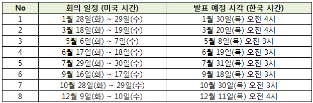 2025년 미국 연방공개시장위원회(FOMC) 회의 일정은 아래 표를 참고하시길 바란다.