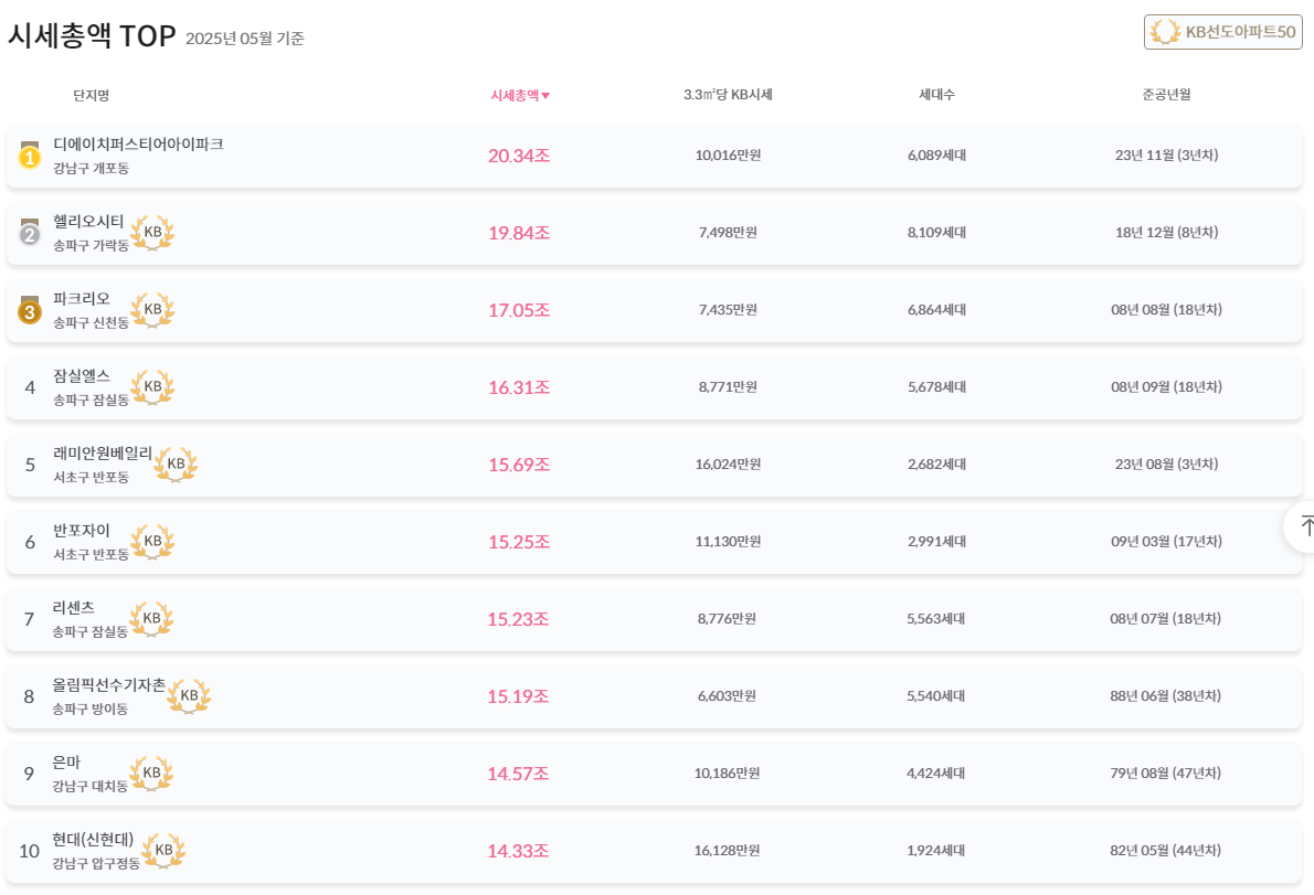 2025년 5월 기준 우리나라 아파트 시세총액 Top 10을 알아보자!