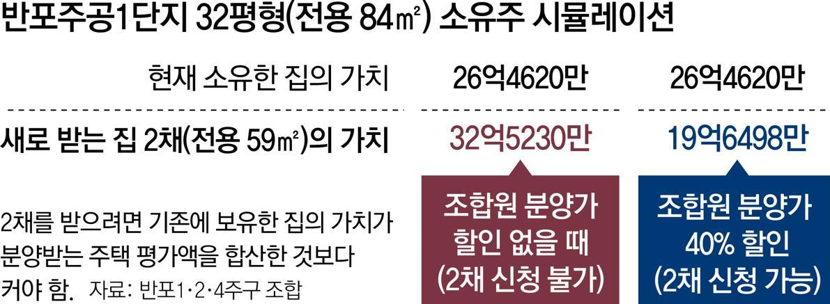 그래서 조합에서는 내부 합의에 따라 조합원 분양가를 할인하여 새로운 집 2채 가격이 기존 집 1채의 가치보다 낮게 만들어 1+1 제도에 부합하도록 하는 것이다.