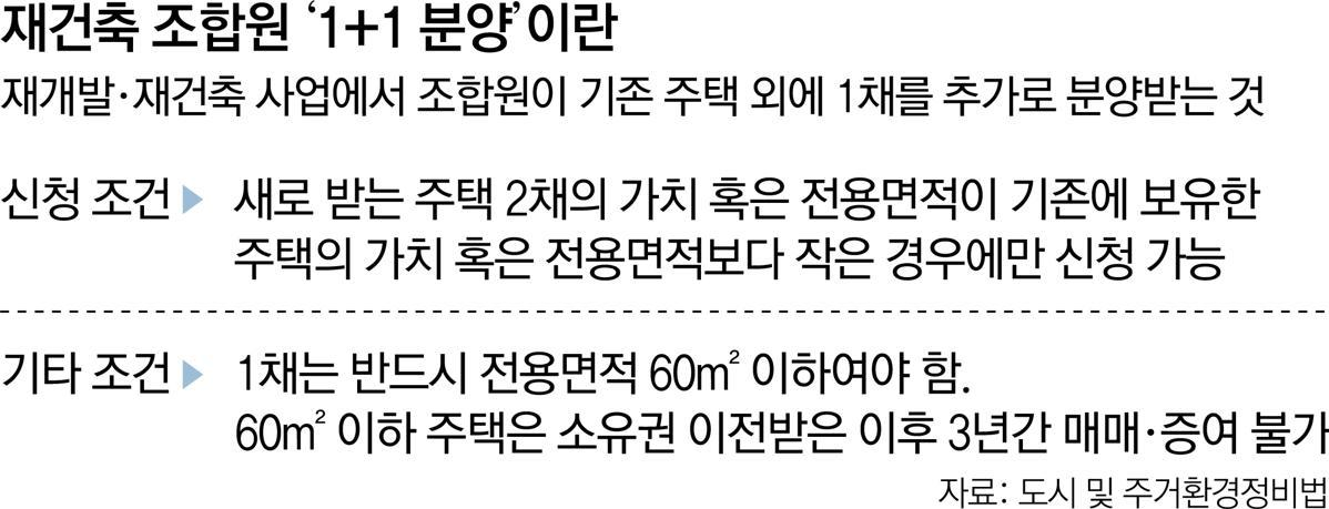 우선 370채가량이 더 나올 수 있던 이유는 '도시 및 주거환경정비법'에 따라 재건축 조합원이 총 2채를 받을 수 있는 1+1 분양 제도의 조건 때문이다.