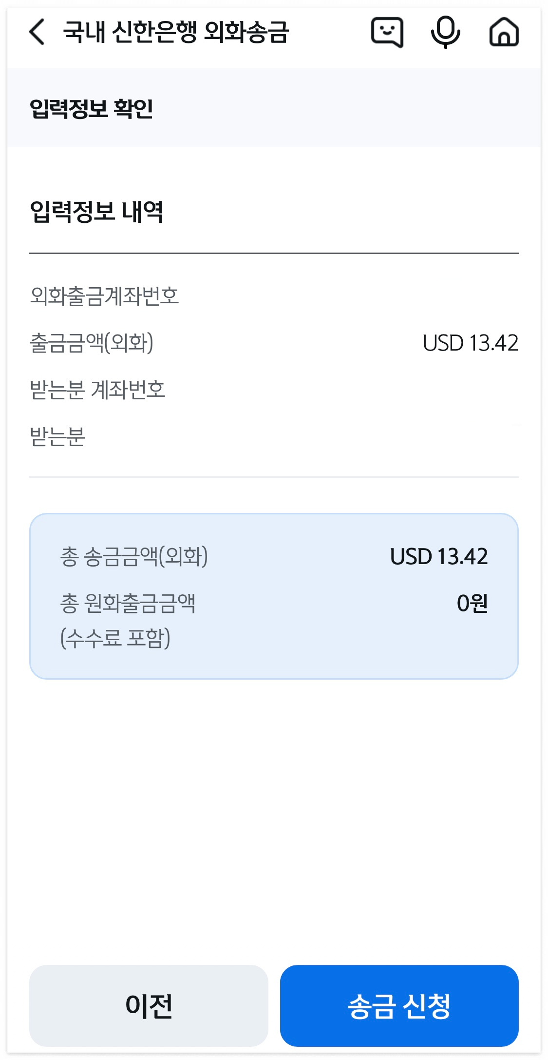 수수료가 없는게 아주 큰 장점이다. 문제 없으면 하단에 '송금 신청' 버튼을 누른다.