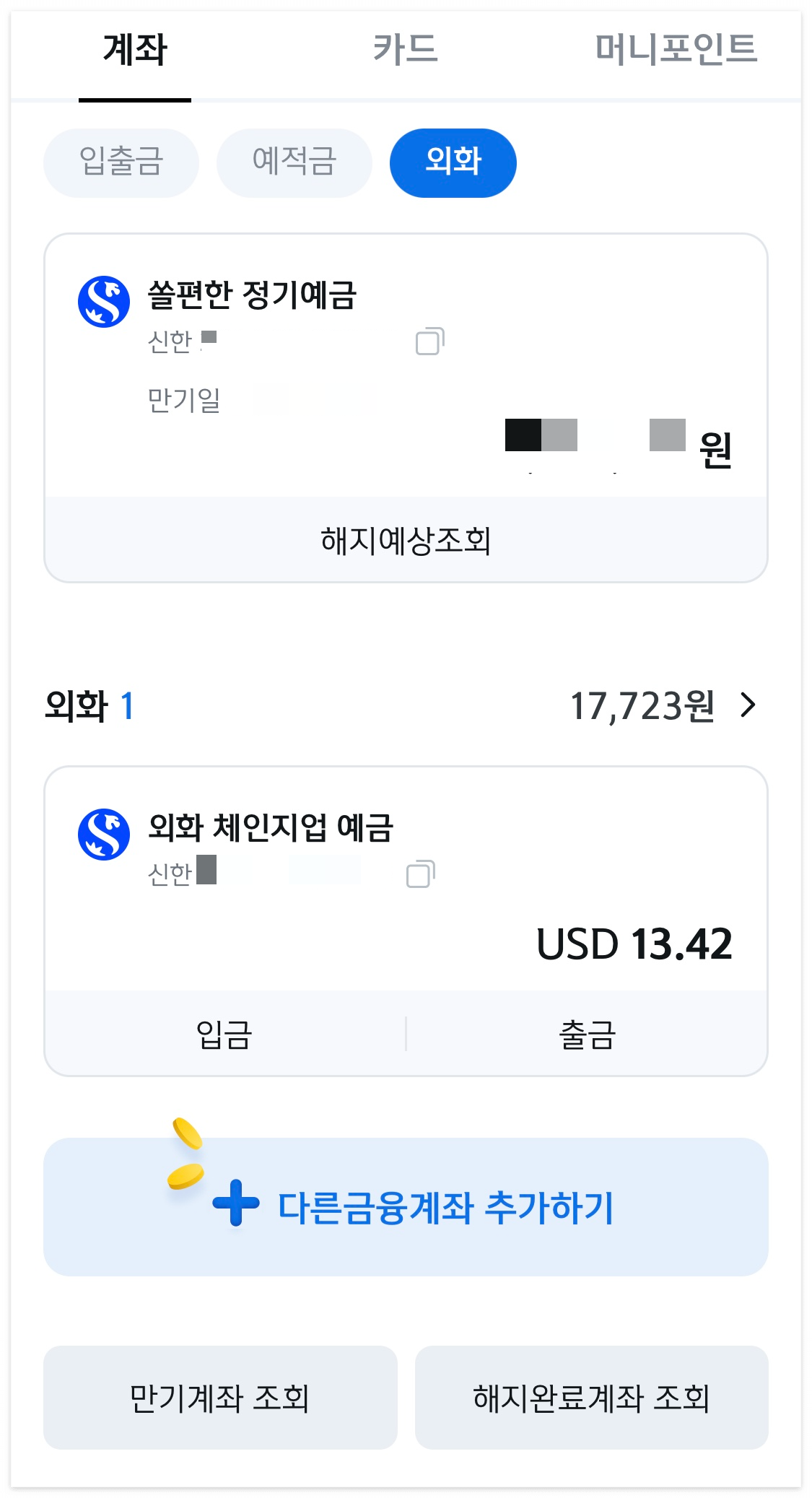 우선 신한 쏠 (Sol) 앱에서 전체계좌 조회를 해보자. 그러면 외화계좌가 나온다.