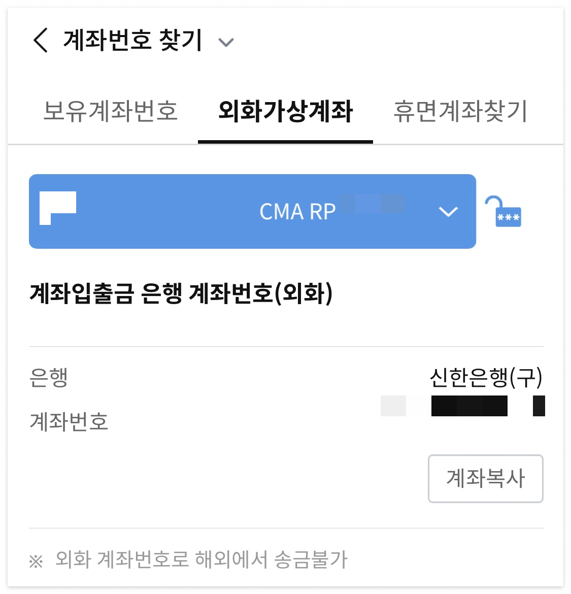여기서 외화 받을 계좌를 찾아야 한다. 참고로 증권사 계좌번호로 하는게 아님.
