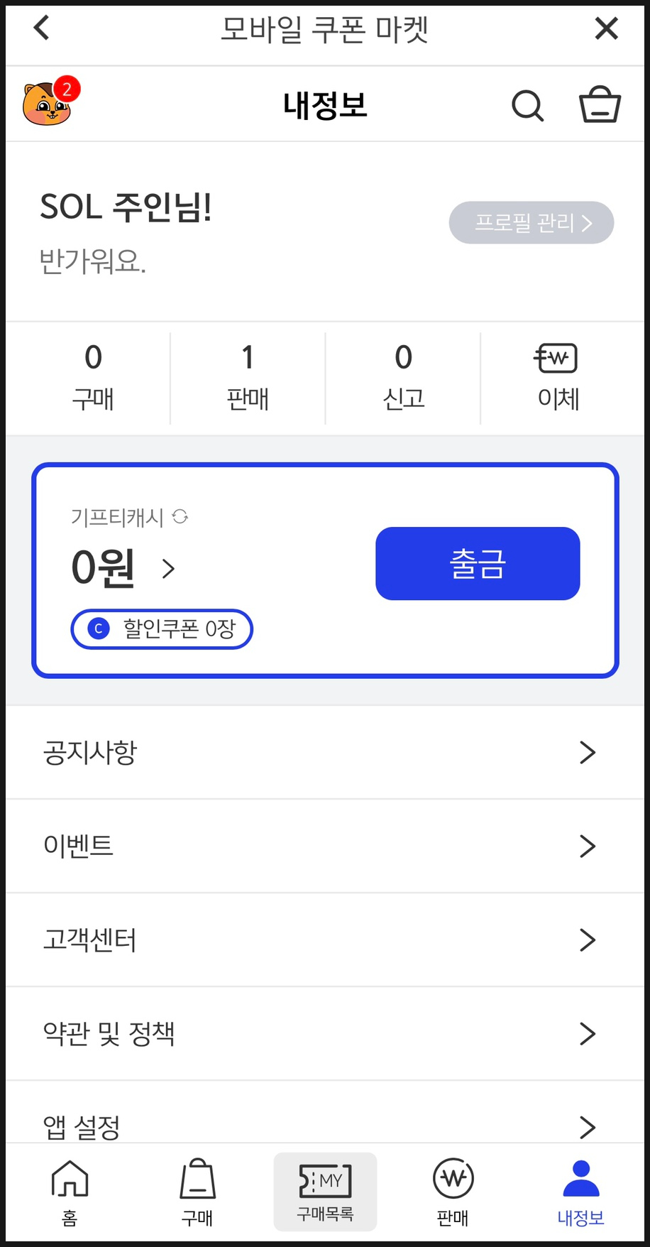 모바일 쿠폰마켓을 들어오면 아래와 같은 화면이 뜹니다.