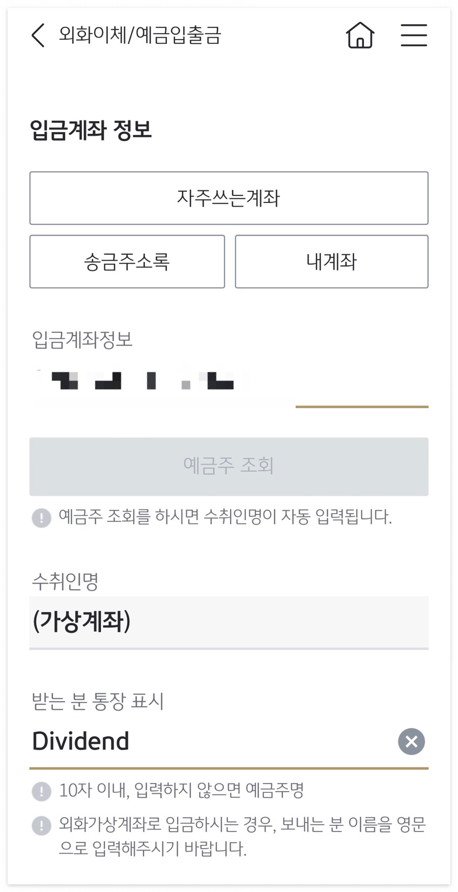 예금주 조회를 하면 가상계좌라고만 뜨고, 받는 분 통장에는 메모를 반드시 입력하라고 뜸.