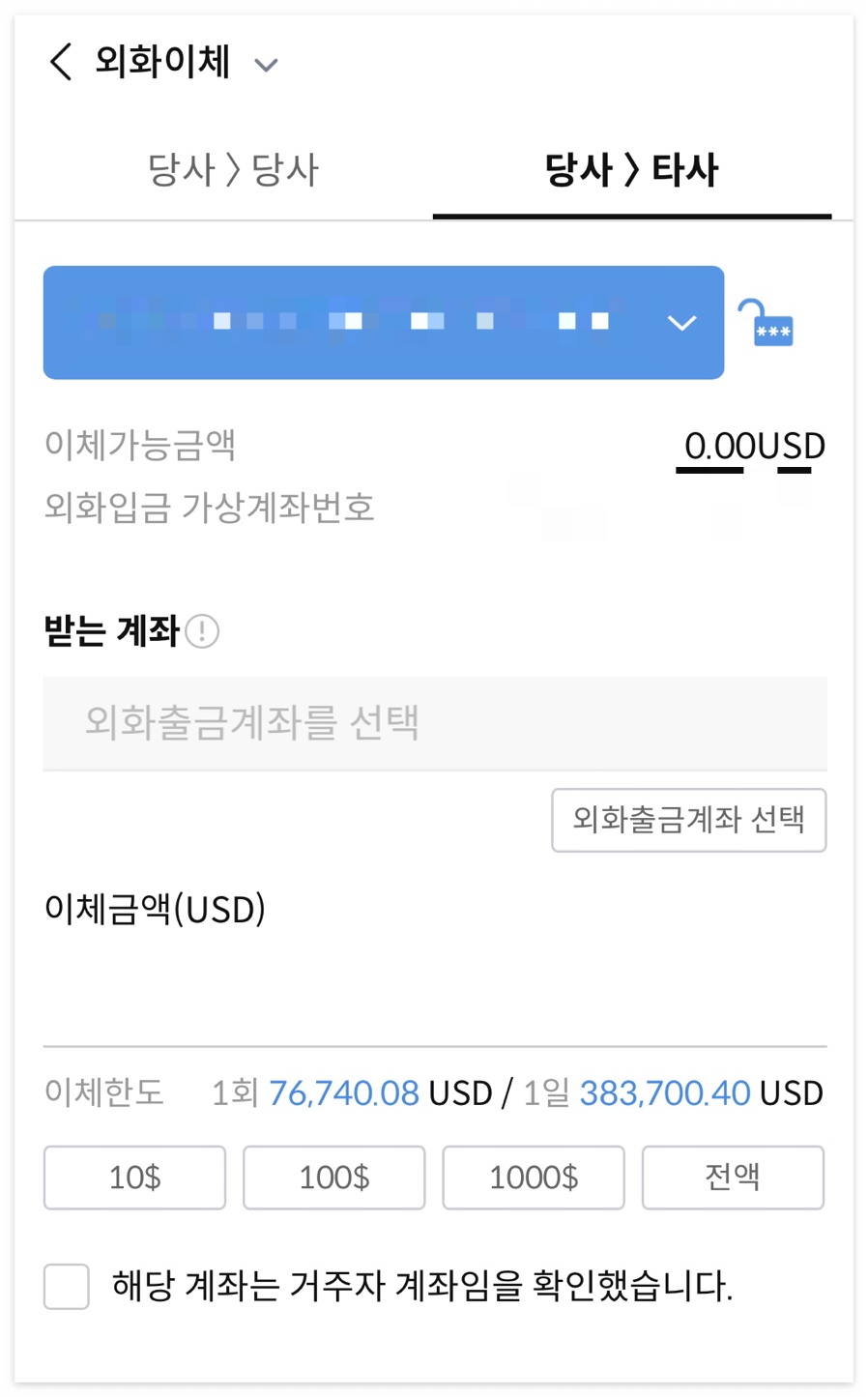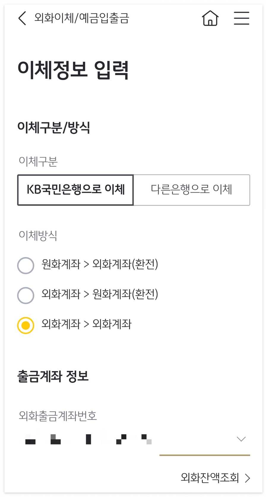 ’KB국민은행으로 이체‘를 고르고, ‘외화계좌>외화계좌’로 선택한 후, 아까 본 키움증권의 외화 가상계좌를 입력해 준다.