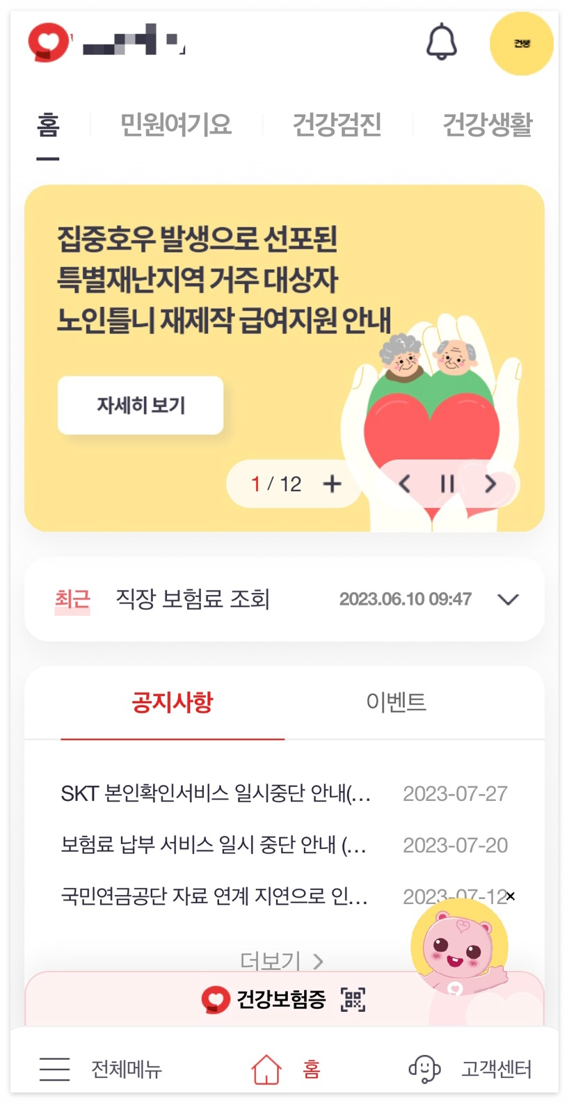 직장인이 아닌 개인사업자 등 건강보험 지역가입자들은 ‘지역보험료 조회’로 들어가면 될 듯하다 (직장인이라 지역가입자는 확실하겐 모르겠음..)