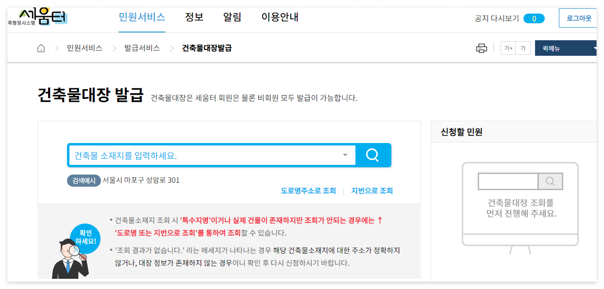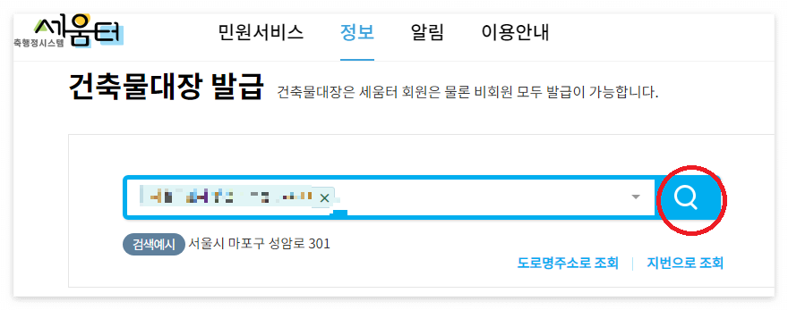 건축물대장 발급 페이지에 들어오면 건축물 소재지 주소를 입력해야 한다.
