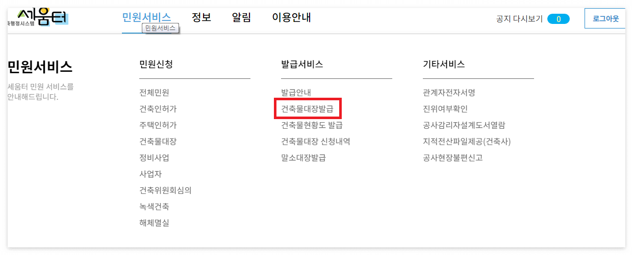 건축행정시스템인 세움터 홈페이지에 접속해보자.