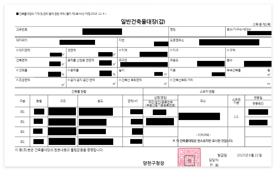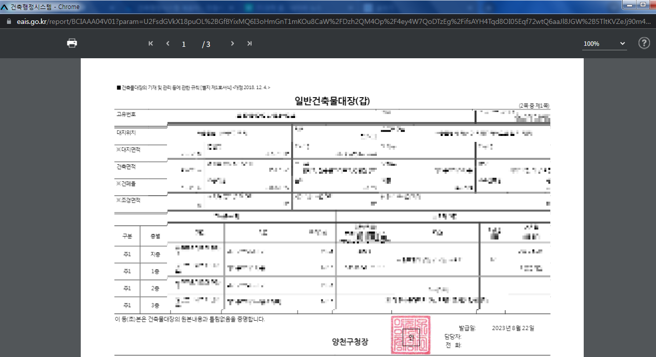 그러면 별도의 창으로 이렇게 건축물대장을 볼 수 있게 된다.