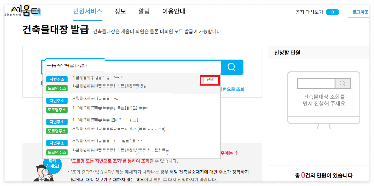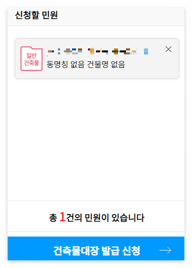 그러면 창 오른쪽에 있는 '신청할 민원'이라는 곳에 해당 건축물이 표시된다.