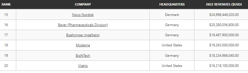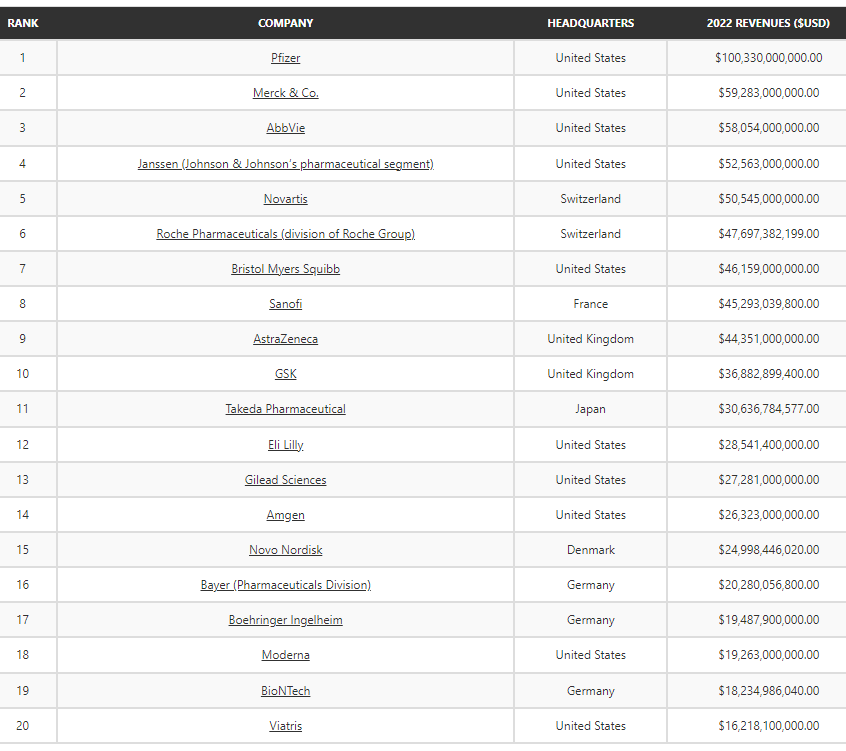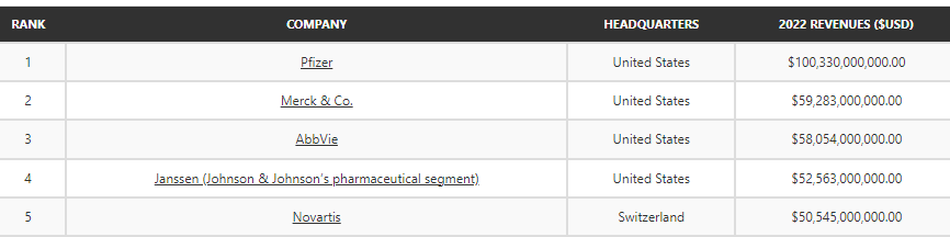 매출액기준과 시가총액 기준으로는 순위에 차이가 있긴 하겠지만 매출액 기준으로 세계 최대의 제약회사를 확인해보자.