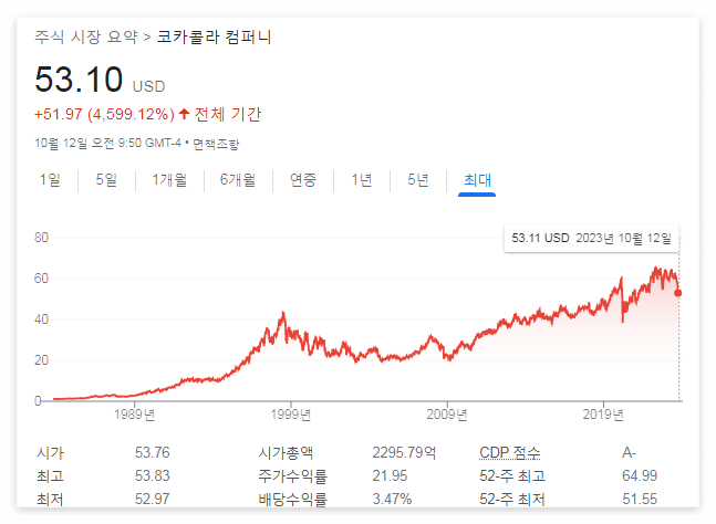 설명이 별도로 필요 없을만한 회사인 코카콜라다. 워런버핏이 오랜 기간 투자해 온 회사로도 이름나있다.