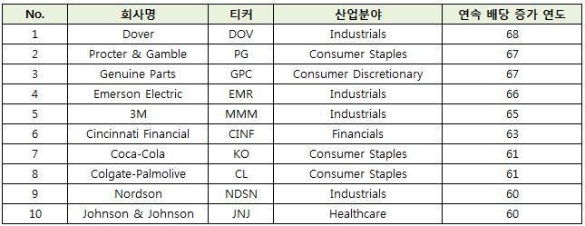 지금까지 배당을 오랜기간 늘려온 배당귀족주 Top 10을 알아봤다.