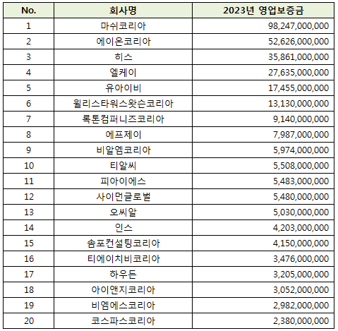 아래 표는 2023년 보험중개사 영업보증금 기준 1위 - 20위다.