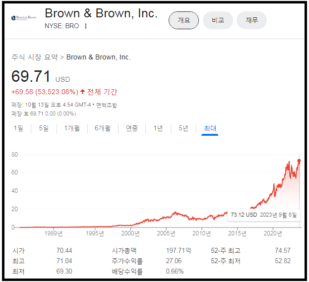 브라운 앤 브라운은 최초상장일부터 지금까지 약 53,000%가량의 주가 성장이 있었다.