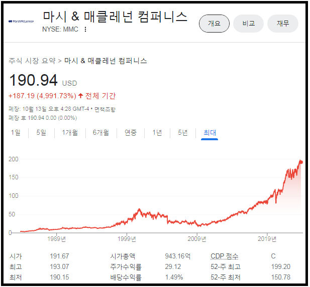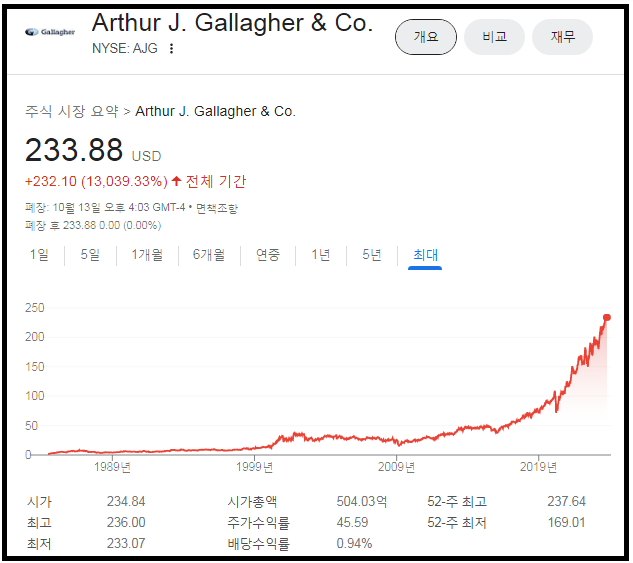 뉴욕증시에 상장되어 있으며, 지금까지 주가를 봤을 때 앞선 Brown & Brown과 마찬가지로 아름다운 우상향 그래프다.