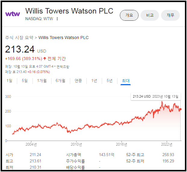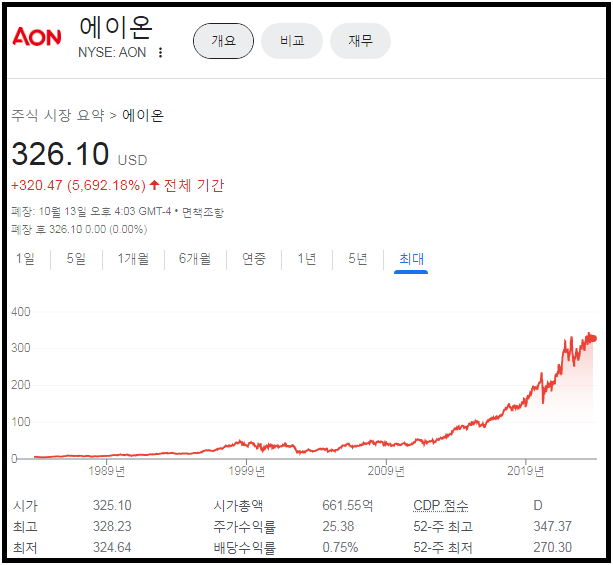 앞서 WTW에서 거론해지만 세계 2위 보험중개사는 AON이며, 뉴욕증시에 상장되어 있다.