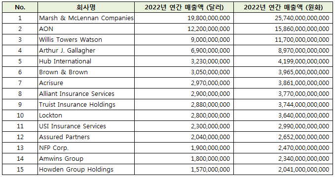 지난 포스팅에서 글로벌 보험중개사 Top 15위 리스트를 다시 한번 가져왔다.