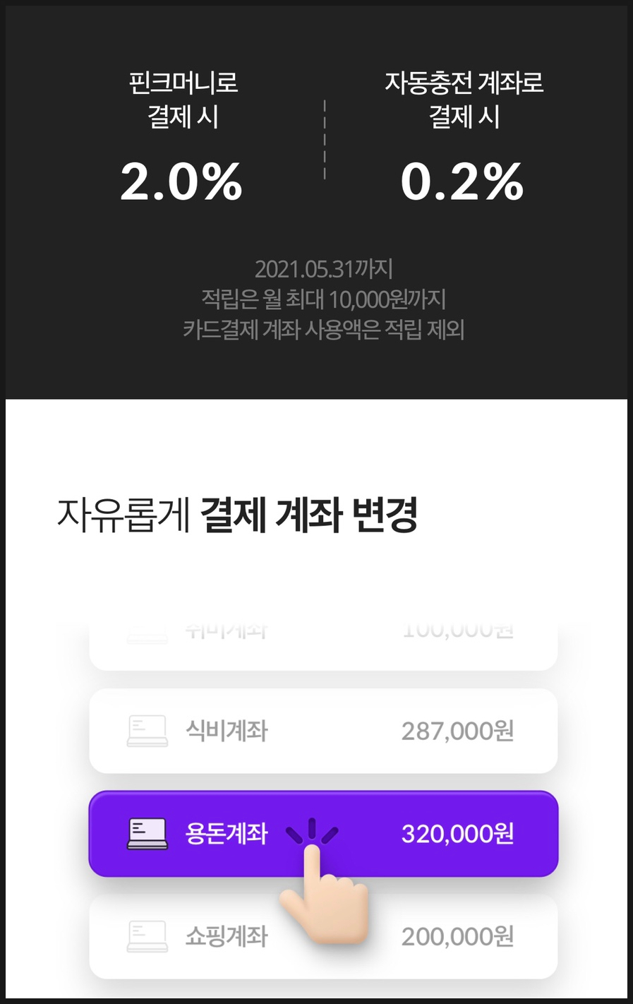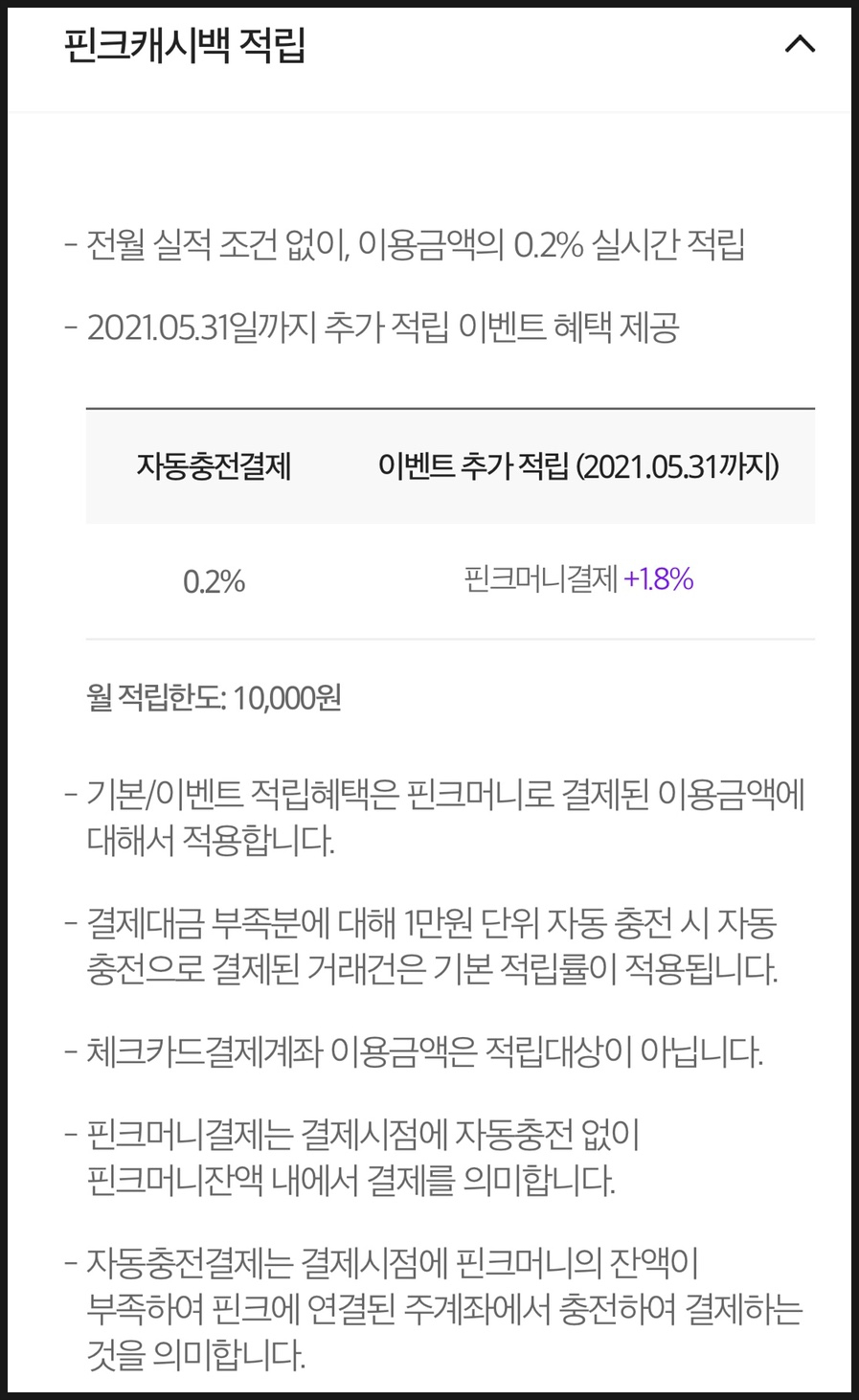 핀크머니 잔액이 없으면 자동충전 계좌에서 결제되기 때문에 0.2%밖에 적립이 안됩니다. 그러니 꼭! 핀크머니를 미리 충전해 두셔야 합니다.