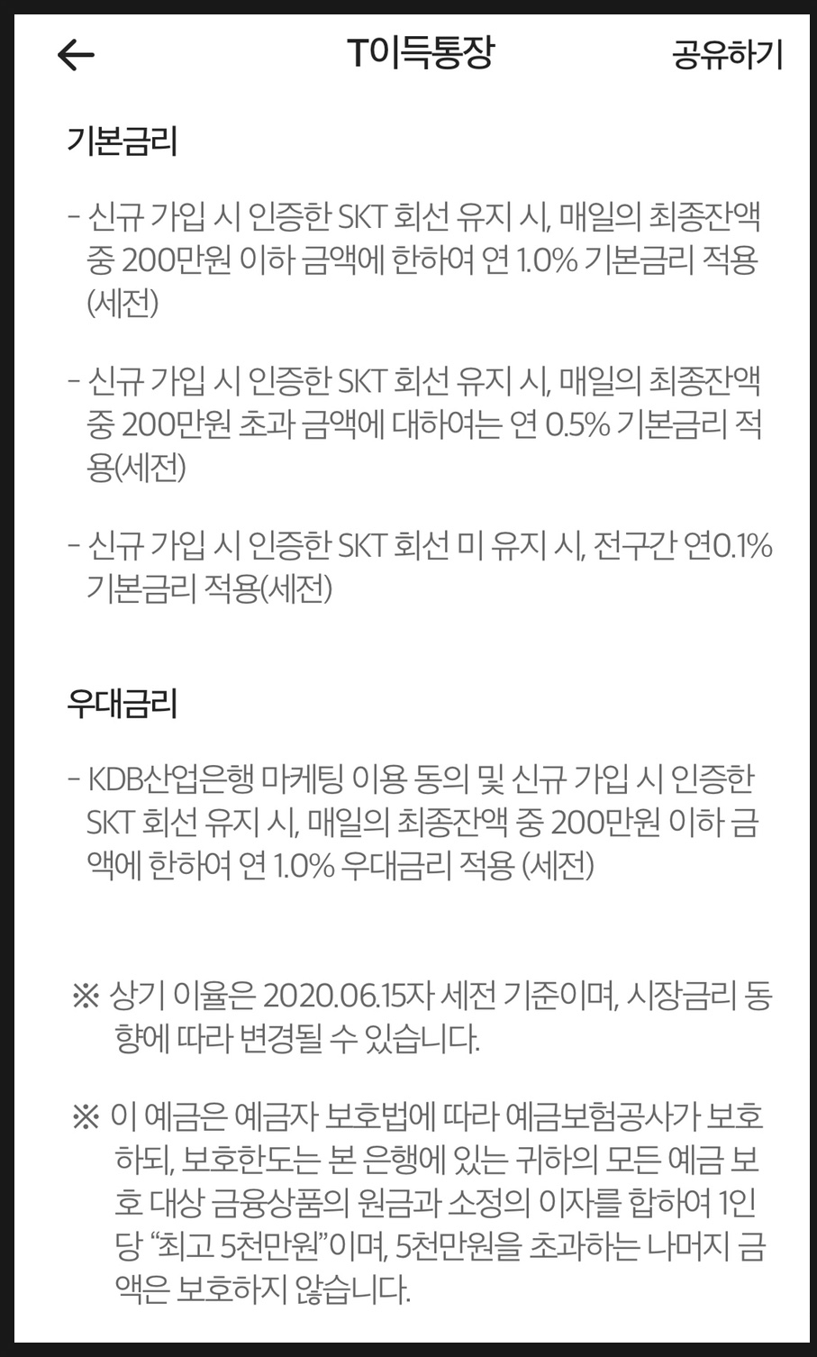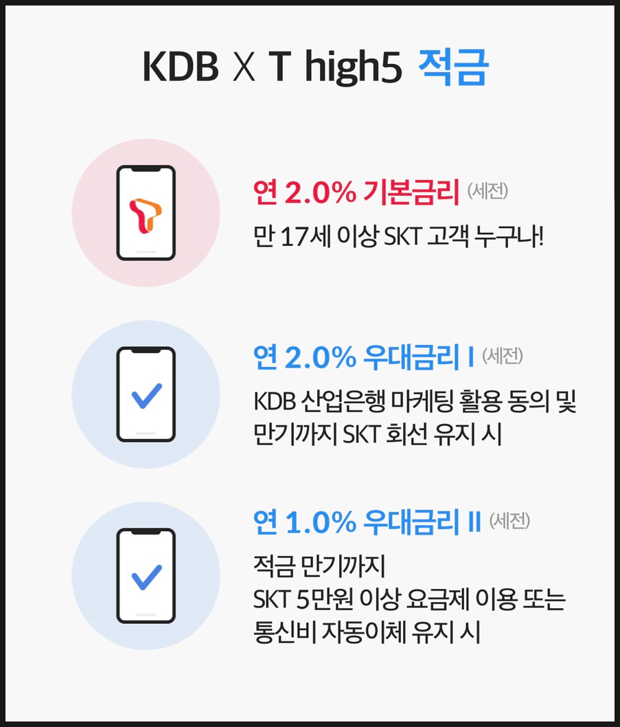 SKT 사용자 기본금리 연 2.0% + KDB 산업은행 마케팅 활용 동의 및 SKT 유지시 연 2.0% 우대금리 + SKT 요금제 5만원 이상 사용시 연 1.0% 우대금리 해서 무려 연 5.0% 금리를 제공합니다.