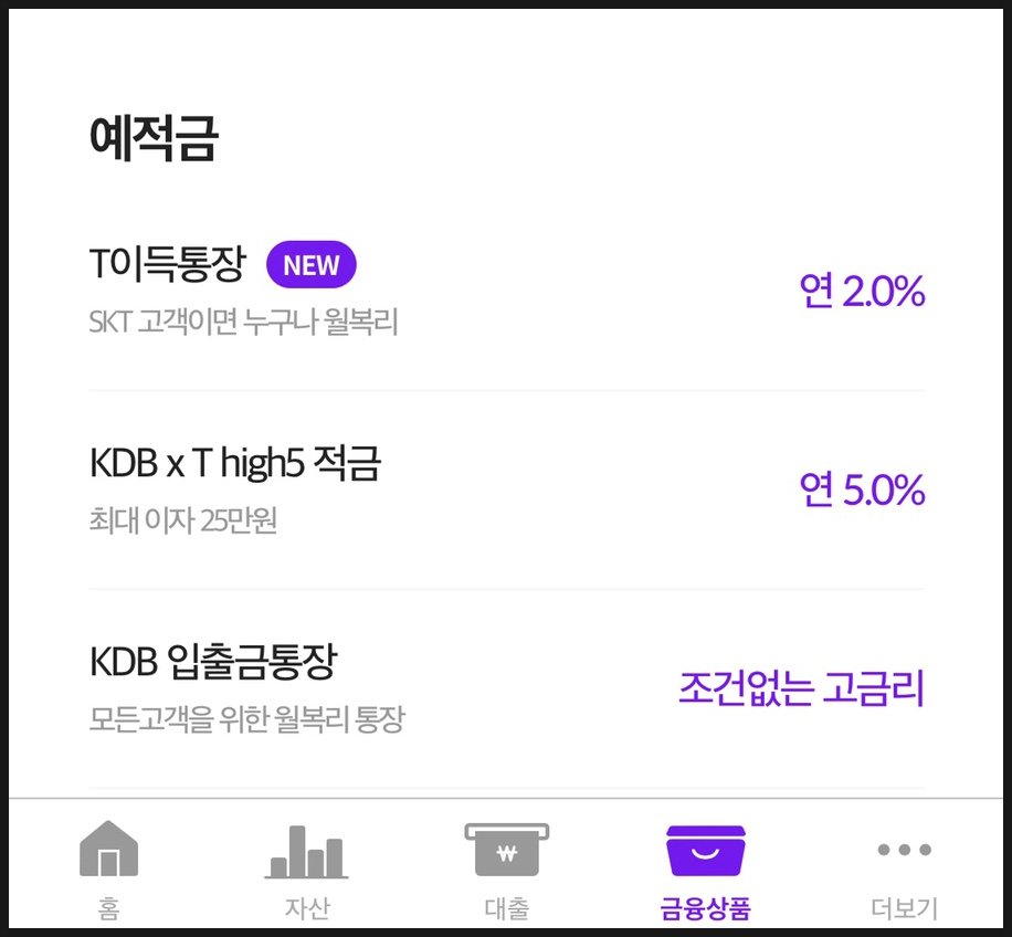저는 T이득통장과 KDB x T high5 적금을 추천 드립니다.