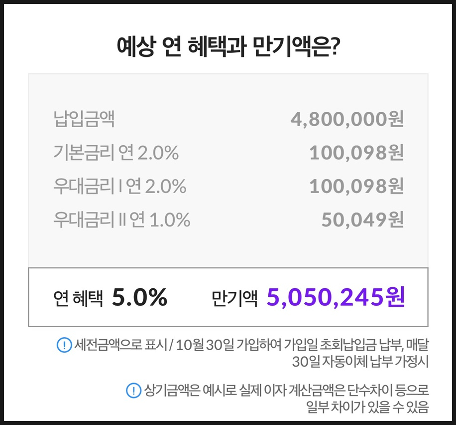 2년 기준은 원금 4,800,000원에 이자가 약 250,000원 정도 붙네요.