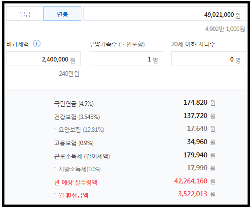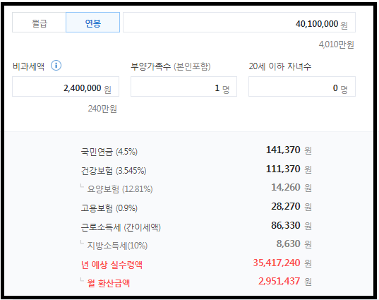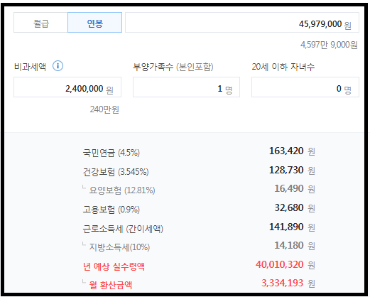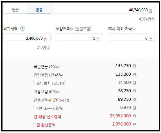 세후로는 약 4,017만원이고 월 실수령액은 334만원 정도다.