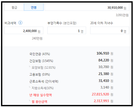 세후금액은 각 회사에서 세금 떼는 방식이나 개인부양가족 등에 따라 차이가 있는 점은 참고해서 봐야 한다.