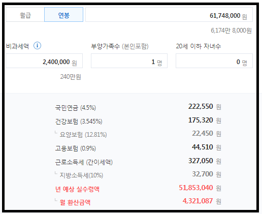 세후로는 약 5,185만원이고 월 실수령액은 432만원 정도다.