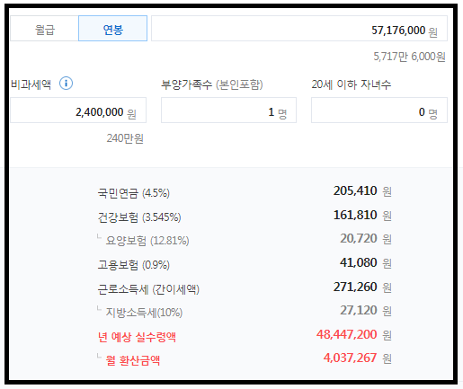세후로는 약 4,844만원이고 월 실수령액은 403만원 정도다.