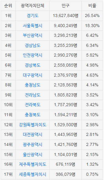 1,2,3위만 합쳐도 대한민국 인구의 절반이 거주하고 있다.