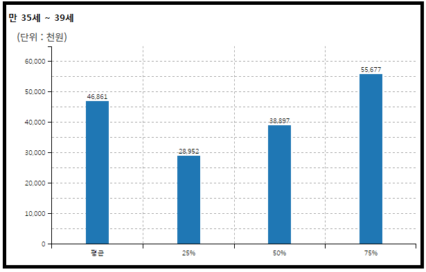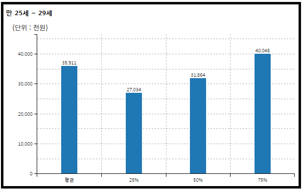평균 기준으로는 동일 연령 남성 직장인 대비 약 2,800만원 정도 적고 중위 기준으로는 2,900만원 정도 적다.