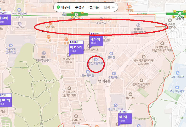 하지만 강력한 학군 지라 대구인들이 선호하는 동네다. 가장 부동산 가격도 높다.