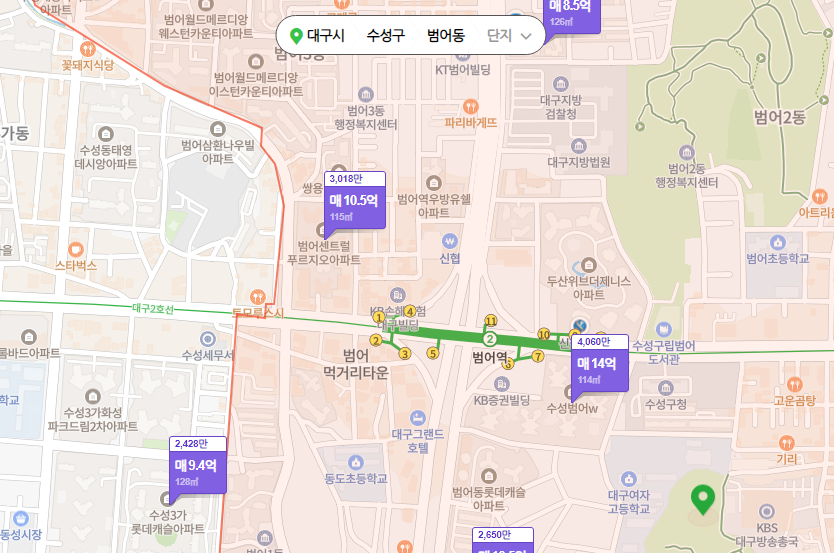 지방은 대부분 차를 활용해서 대중교통이 서울 수도권만큼 부동산에 임팩트가 있지는 않지만, 어쨌든 수성구청역과도 인접한 게 장점이다.