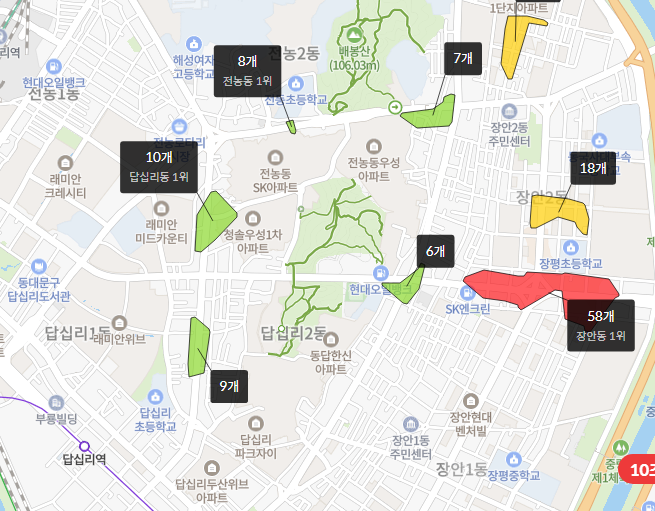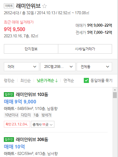 래미안위브의 경우 2,652세대 대단지고 답십리역에서는 좀 더 멀다. 25평 매물이 10 억정도고 33평 매물이 11.5억 정도다.