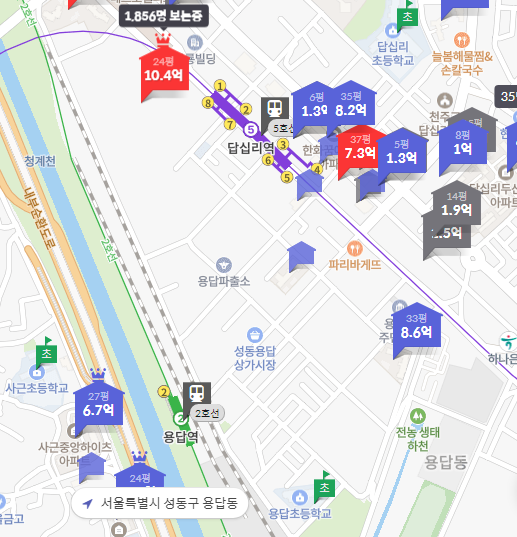 신답역 초역세권이자 마찬가지로 청계천 앞에 있는 힐스테이트청계의 경우 25평이 10억, 34평이 12.5억 정도로 매물이 나와있다.