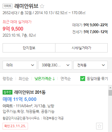 이 두 아파트에 비해 27년식이니 10년 가까이 차이 나긴 하지만, 현 시세 기준으로는 프리미엄이 크지는 않다고 본다.