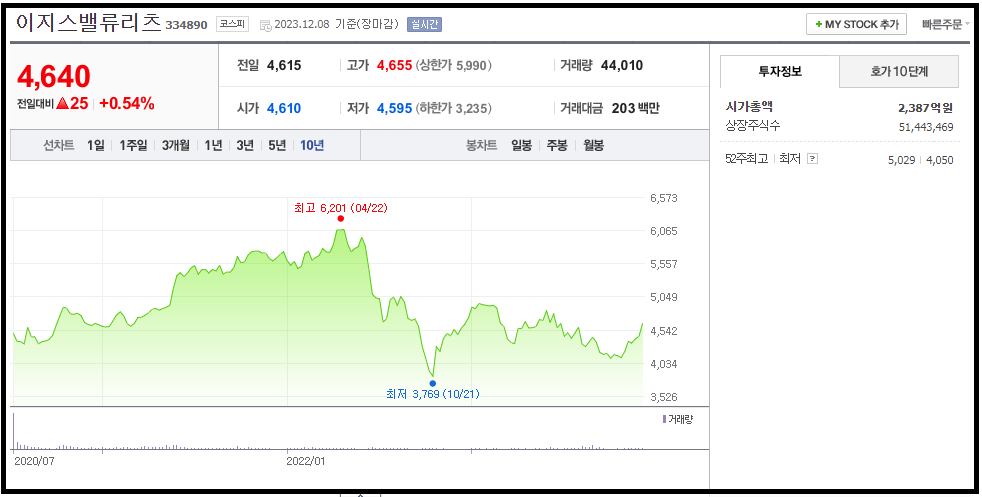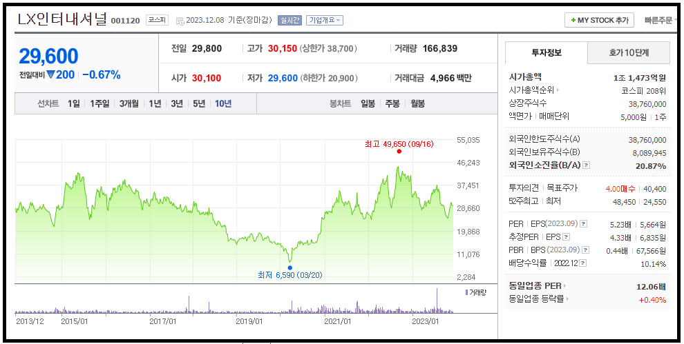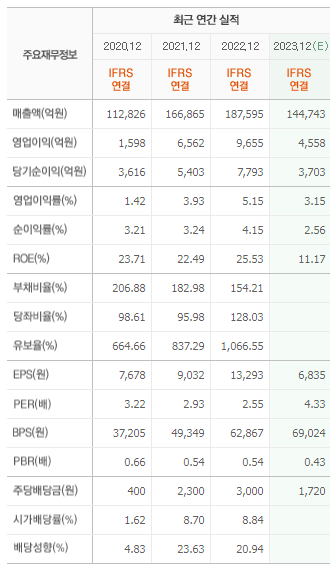 PER은 5.23배, PBR은 0.44배로 상당히 건실하다고 볼 수 있다.