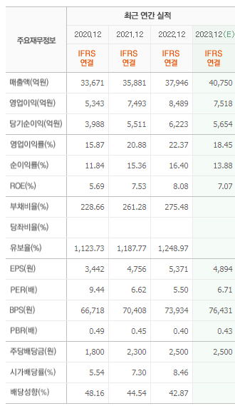 매출액은 지속적으로 증가했고, 2023년 예상 매출액은 아직 확정되지 않았지만 영업이익은 전년대비 상승할 것으로 보인다. 그래서 4개년 연속 배당금 증가가 예상된다.