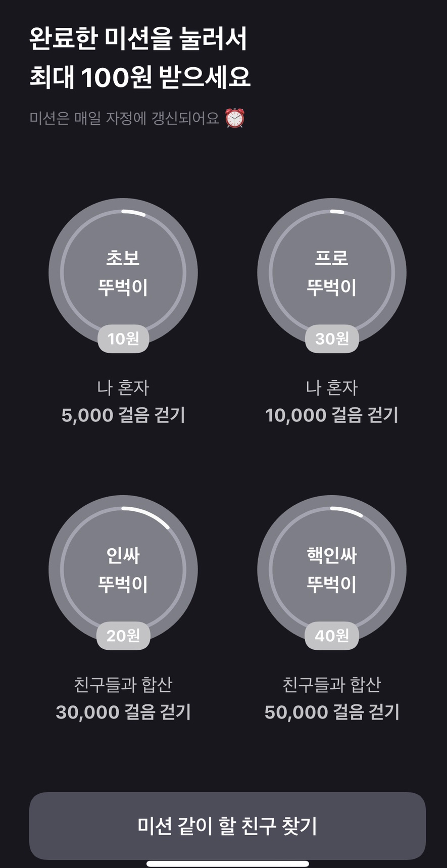 나머지 두 가지 미션은 친구들과 합산하여 30,000보와 50,000보 걷기입니다. (20원 + 40원 = 60원)