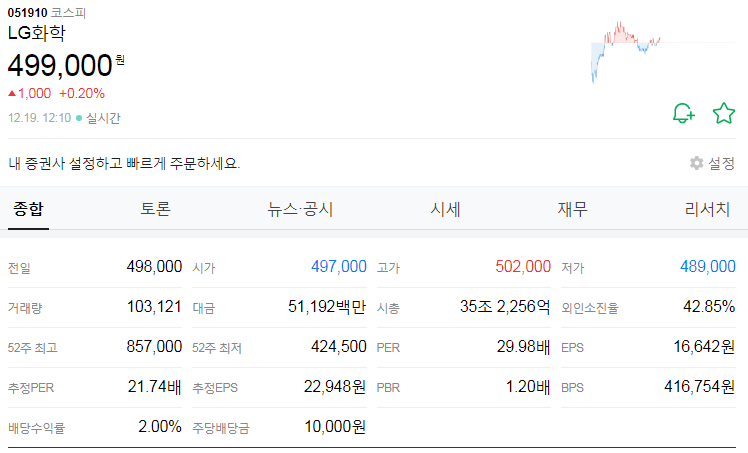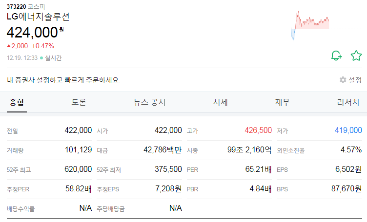 LG화학에서 분사되어 별도 상장했는데, 산업의 관심만큼 높은 시가총액을 자랑하고 있다.