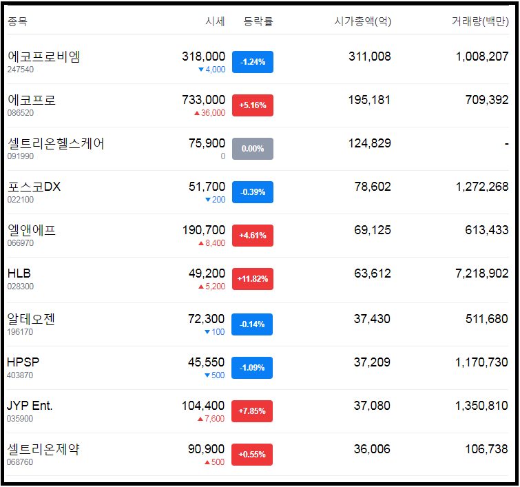 코스닥은 JYP, HPSP 그리고 다음에 나오는 포스코DX 빼고는 2차 전지와 바이오로만 이루어져 있다고 보면 된다.