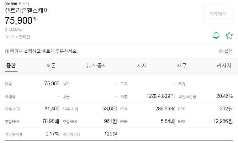 2023년 12월 15일을 마지막으로 코스닥에 상장되어 있는 셀트리온과 합병 상장으로 거래가 정지되었다.